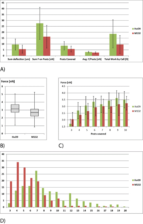 图4 骨癌细胞系力学状态。(A)骨癌细胞系HuO9(低转移性)和M132(高转移性)应力分布的比较,HuO9细胞具有更高的指标值。(B)细胞产生的力较小,在nN水平,HuO9产生的拉力比M132大。(C)覆盖相同微柱数的HuO9细胞产生的拉力比M132大。(D)两种细胞覆盖的微柱数具有不同的分布,说明二者与微柱的相互作用具有各自的特点。