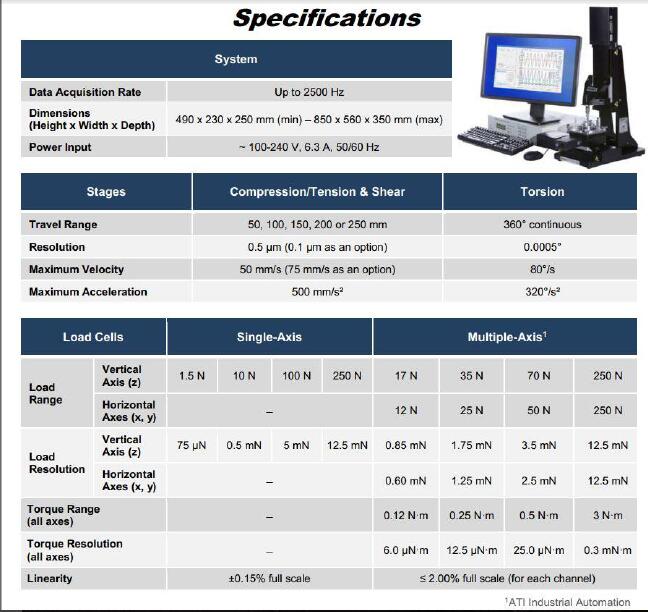 该多轴机械测试仪是能集成压缩、张力、剪切、摩擦、扭转和压痕、活性组织电位分布测试的一体化测试与培养装置。能对生物组织、聚合物、凝胶、生物材料、胶囊、粘合剂和食品进行精密可靠的机械刺