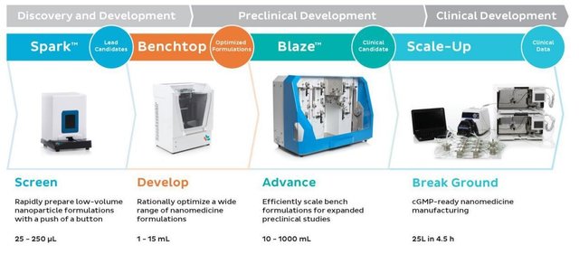 The NanoAssemblr Spark用于研发过程中加速生产超低量纳米药物制剂。应用其特有的微流控技术, Spark可促进颗粒均一自组装,10秒内即可完成25-250 μL纳米粒的制备,过程可控且可重复。因其接近于100%的高产率, Spark是制备昂贵核酸材料和其他稀有辅料的新型纳米制剂处方筛选的理想选择。