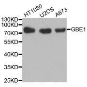 GBE1 Antibody is a Rabbit Polyclonal antibody against GBE1. The protein encoded by this gene is a glycogen branching enzyme that catalyzes the transfer of alpha-1,4-linked glucosyl units from the outer end of a glycogen chain to an alpha-1,6 position on the same or a neighboring glycogen chain. Branching of the chains is essential to increase the solubility of the glycogen molecule and, consequently, in reducing the osmotic pressure within cells. Highest level of this enzyme are found in liver and muscle. Mutations in this gene are associated with glycogen storage disease IV (also known as Andersen's disease).