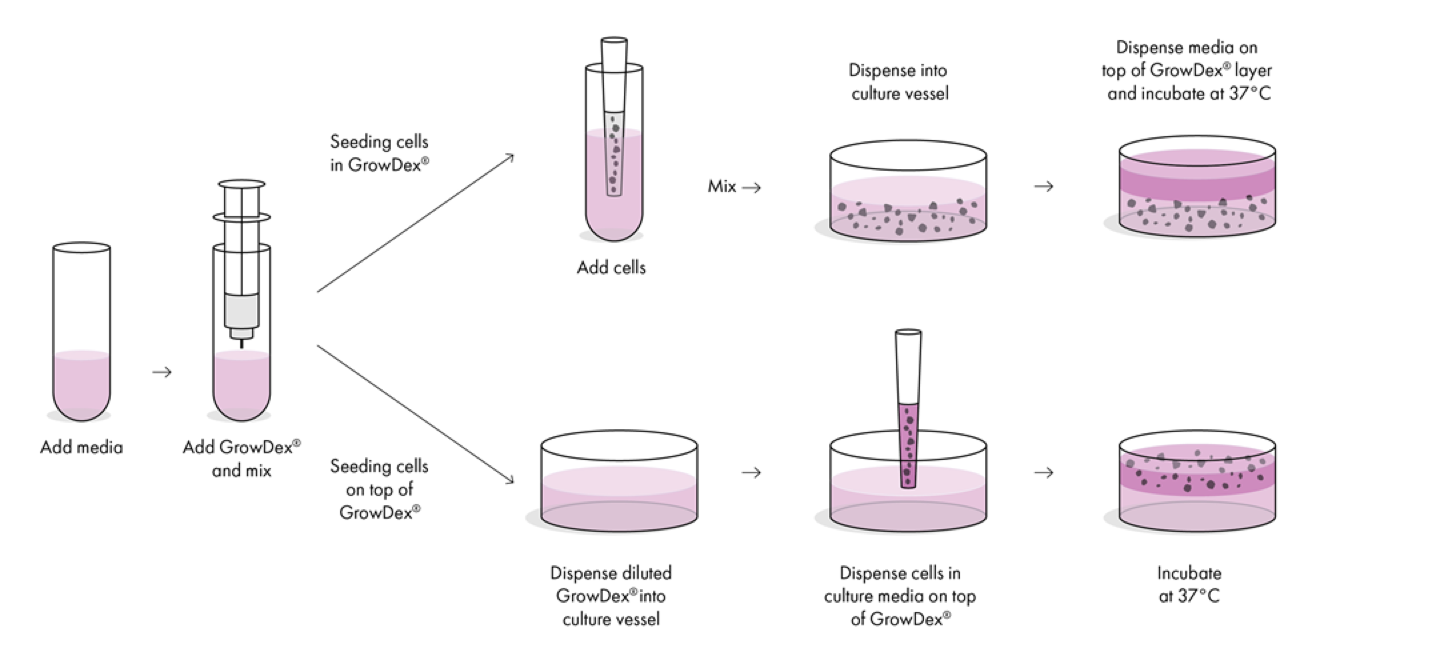 即用型 GrowDex使得细胞培养变得非常简单。只需要将培养基、细胞和GrowDex混合在一起,接种到孔板中即可。