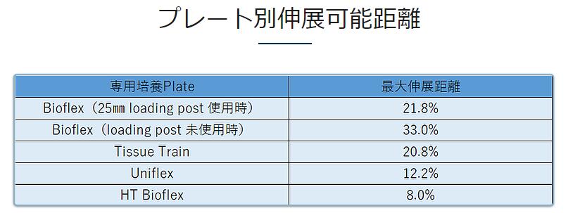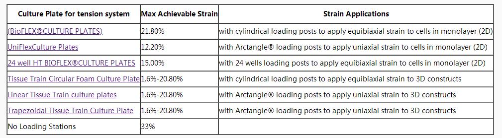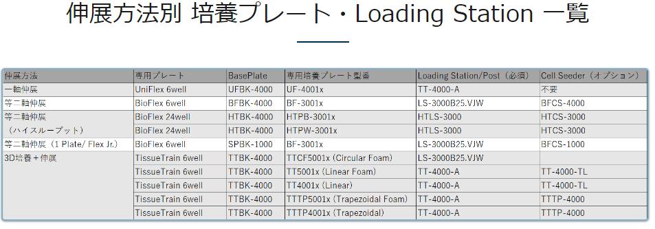 このシステムには、専用培養プレート、BioFlex®(等二軸伸展)または UniFlex®(一軸伸展)が必要となります。その他、細胞をWell中心に培養するためのCellSeeder、伸展するのに必要な土台(Loading Station/ Post)の組合せは下記の表をご覧ください。
