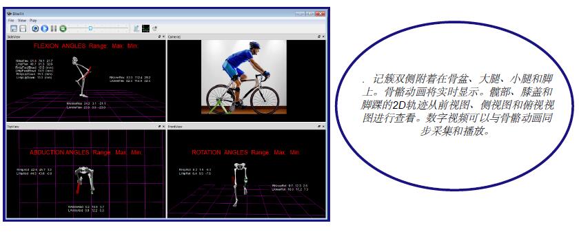 研究级硬件 3D 实时评估利 用一个系统来跟踪和分析骑手在自行车上的双边 3D 位置和方向。 查看左右髋关节屈曲、外展、旋转和左右髋上/下等数据。 同时双边采集揭示了改变骑手身体一侧的变化对身体另一侧的影响。
