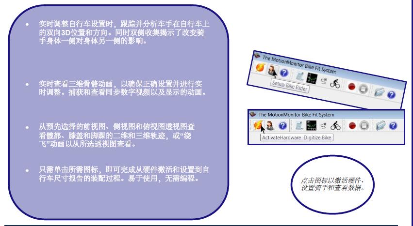 使用比赛背后的科学 该系统 使在自行车合身期间实时采集复杂的、研究质量的数据变得快速而轻松。 查看沿自行车尺寸的骑手生物力学,以监控合身度的相关性。 与其他声称支持 3D 跟踪的系统不同,该系统 Bike Fit 系统可跟踪 6 个自由度 (6DoF),其中包括 3D 位置和 3D 方向。 您次可以在整个踏板行程中跟踪双侧髋关节、膝关节和踝关节的旋转……you化骑手表现的贴合的关键数据。 包括多达 3 个高清数码相机来记录骑手的同步视图。 后,通过肌肉活动 (EMG) 分析、力数据和虚拟现实等功能扩展系统。