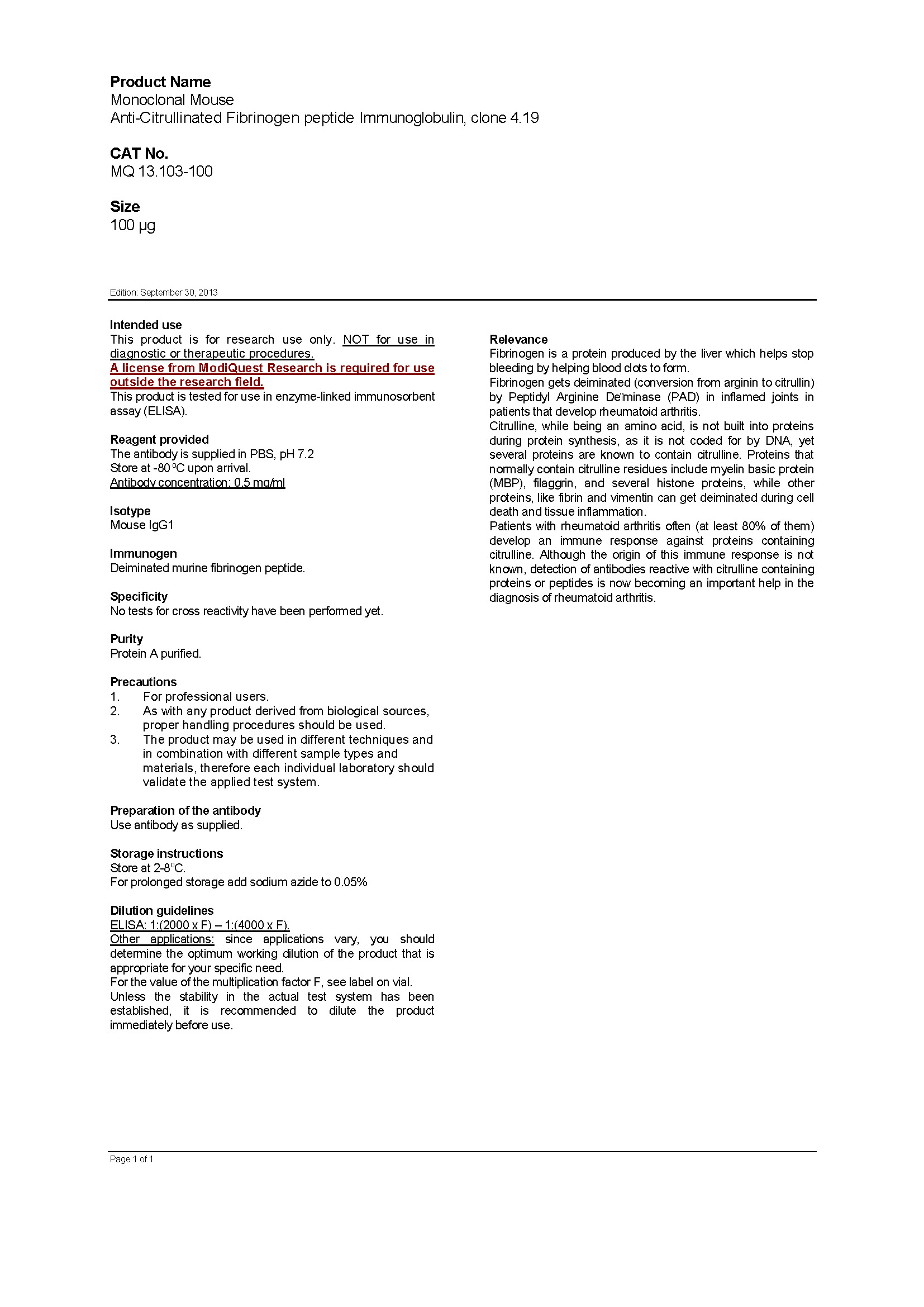 This product is tested for use in enzyme-linked immunosorbent assay (ELISA) or immunoblotting (IB) and immunohistochemistry (IHC). Mouse IgG1 isotype. The antibody is supplied in PBS, pH 7.2. Antibody concentration: 0.5 mg/ml, 100μg total. For further reagent details, refer to the mouse anti-citrullinated fibrinogen monoclonal antibody product specification sheet (clone 4.19):