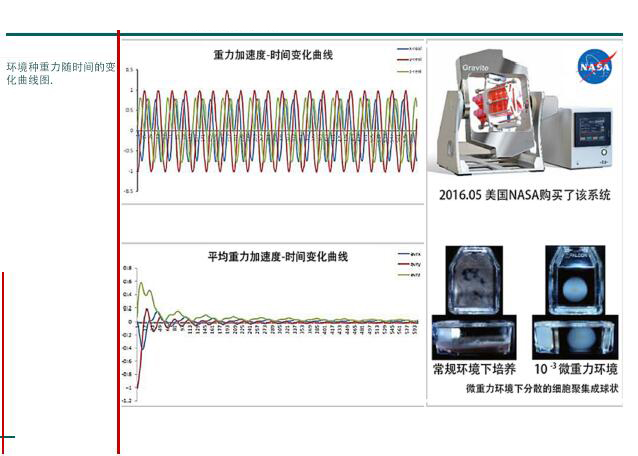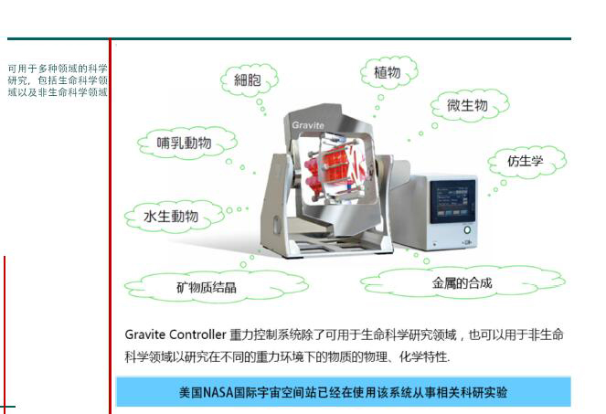 1、微重力,该系统是一种多向G力发生器,可同时控制两轴的旋转。 这一dute的功能允许取消设备中心的累积重力矢量,以创建 与ISS(国际空间站)相同的10 -3 g 微重力环境。