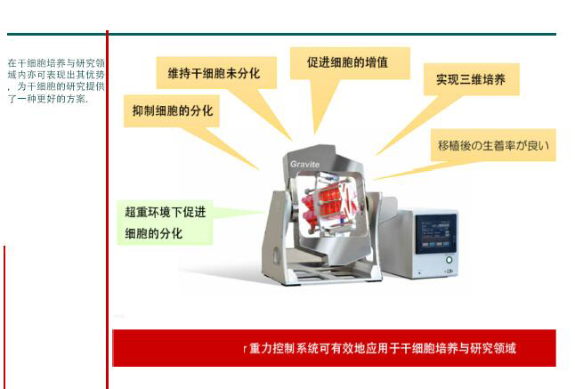 微重力环境为细胞培养提供许多有利之处,超重重力模拟,由于空间wu沉降wu对流的特性,物质可以均匀悬浮,细胞不会因重力场的影响而沉降堆积在一个表面,这对于进行细胞的高密度培养,提高介质的利用率和单位容积的产量,减少其它蛋白的污染都是有利的;并且空间纯净的培养环境,获得更加均一、更加纯净的物质的潜力,防止污染等,