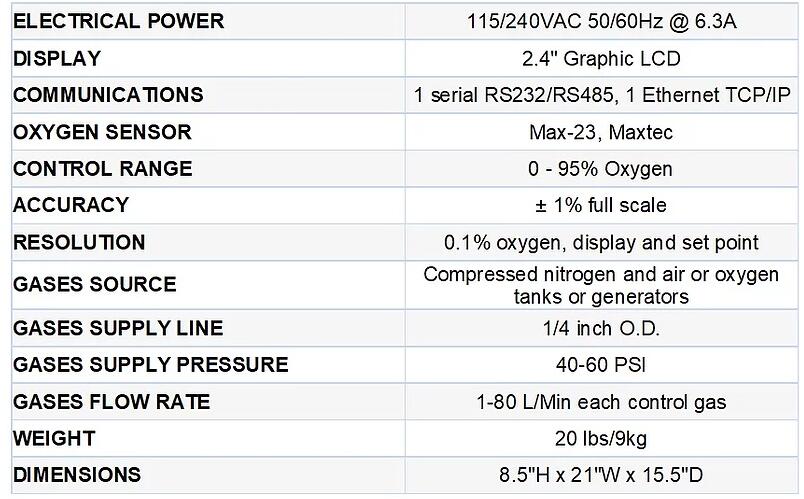 可控制氧气/氧气不足的氧气状况,其设定值范围为O2的0.1-99.9%。