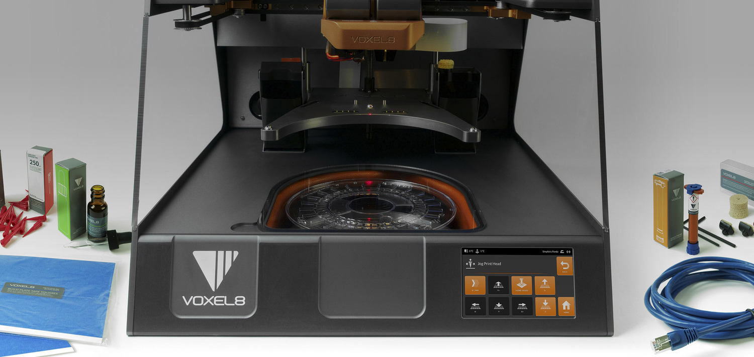 Voxel8的te制油墨会通过一个250微米直径的专用喷嘴进行沉积。一旦打印,会在室温下很快干燥,不需要后处理。这些性质使得它能够在传统的热塑性材料上打印。3D电子打印需要具备在打印过程插入多个元器件的能力。而Voxel8桌面3D打印机配置了一个具有高度可重复性的磁性打印床,能够让您在打印过程中把打印对象暂时取下来,插入元器件,如LED或传感器等,然后再放回去继续打印过程。