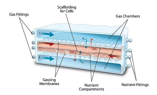 通过顶部和底部的充气室(蓝色箭头)du立于介质输送氧气。 这通过产生营养物和氧气浓度的梯度来降低剪切力并且实现更多的体内环境。