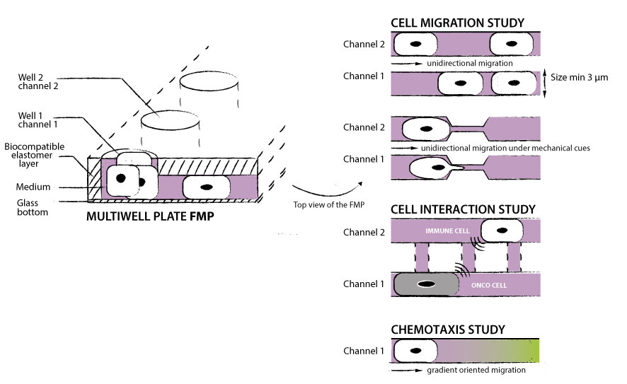 此芯片包含一组可变尺寸的微通道,细胞可在其中迁移。