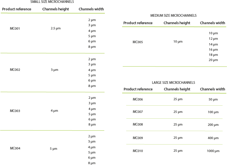 小型微通道芯片设计有不同的高度(MC001,MC002,MC003,MC004)。