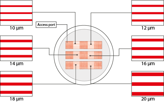施加到您的细胞的3D形状和应力条件取决于微通道的大小。每个芯片具有6个微通道范围和9个访问端口。