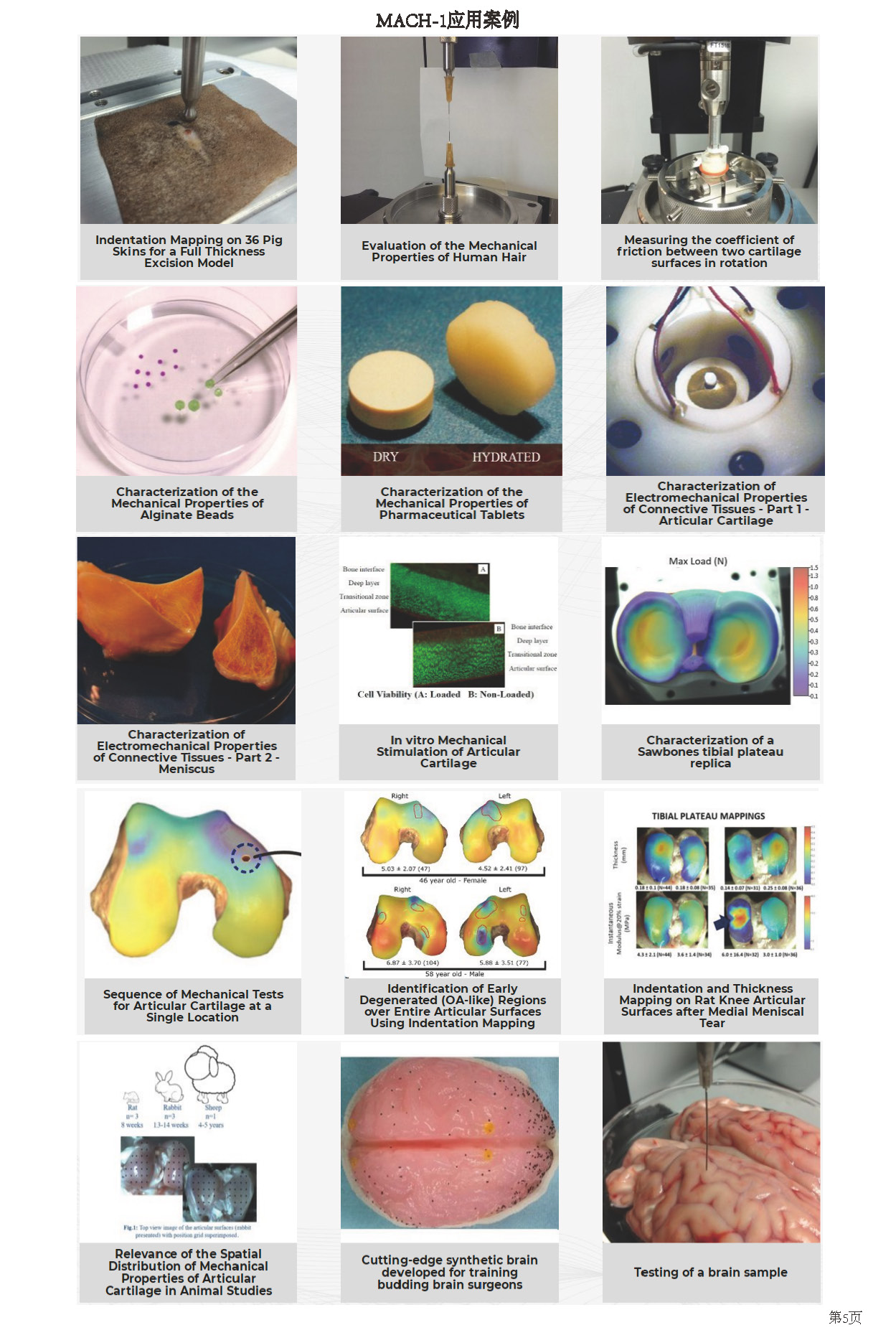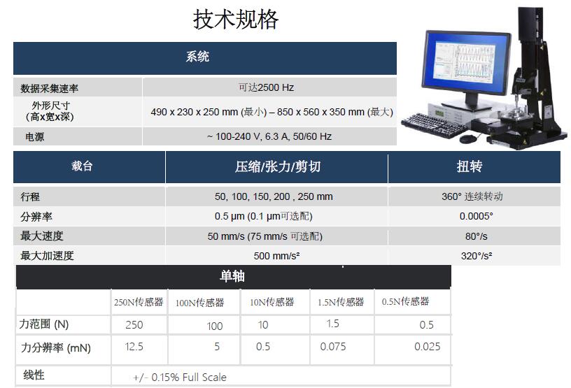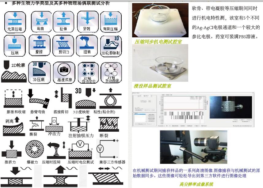 能集成压缩、张力、剪切、摩擦、扭转和2D/3D压痕、3D轮廓及多力混合耦连测试的一体化微观力学测试装置。能对生物组织、聚合物、凝胶、生物材料、胶囊、粘合剂和食品进行精密可靠的机械刺激和表征。允许表征的机械性能包括刚度、强度、模量、粘弹性、塑性、硬度、附着力、肿胀和松弛位移控制运动。