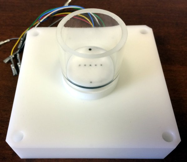 该腔室设计用于在机电活性材料(例如结缔组织,带电水凝胶等)压缩期间同步测量电势分布。 该腔室具有5个差分Ag-AgCl电极通道和一个较大的参比电极。 圆形电极直径为1毫米,它们之间(中心到中心)的距离为4毫米。 可根据要求提供定制的几何形状。 腔室可以充满PBS溶液。