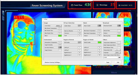 特征: 来往经过员工发烧温度的流量筛选 智能测量算法 身份识别 安装操作超级快速简单 记录和搜索 自动声音报警