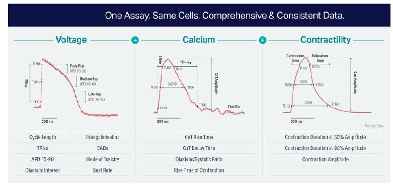 可以代替多电ji阵列、钙瞬态和阻抗测定法。 该系统结合了心脏安quan性评估中的这三种主要测量方法,客户只在一个实验中测量电压、钙和收缩,就可以获得具有显著的准确性的数据,并进一步减少实验可变性的影响,提高了数据质量。