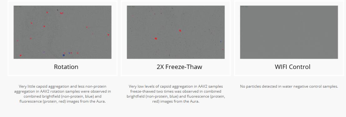 在来自Aura的组合明场(非蛋白质,蓝色)和荧光(蛋白质,红色)图像中,在AAV2旋转样品中观察到的衣壳聚集非常少,非蛋白质聚集较少。
