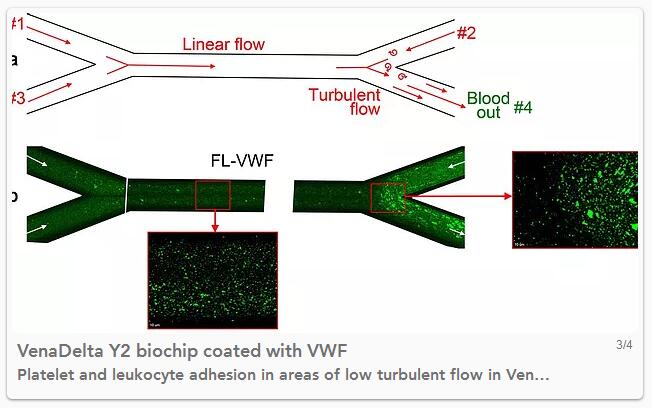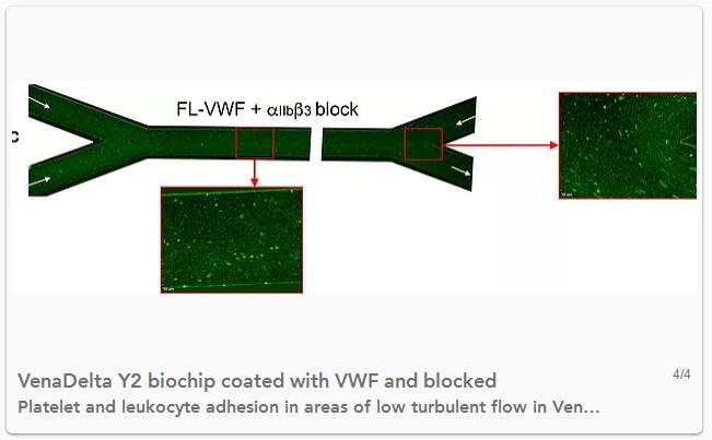 VenaDelta Y2 生物芯片:模拟血管系统的扭曲和分支路径,导致更扰乱的流动模式,尤其是在瓣膜周围。 例如,研究人员使用在较低剪切条件下具有变化几何形状的通道表明,VWF 在扰动流动的区域中明显更有效地捕获血小板。