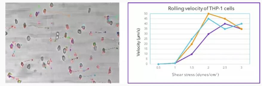 使用 Image Pro Premier 对 Vena8 Fluoro+ 生物芯片的 E-选择素包被微毛细血管上的 THP-1 细胞进行滚动速度分析