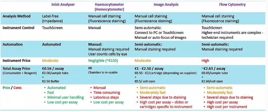 下表比较了使用阻抗谱的 Cellix Inish Analyzer; 到常用的细胞计数和活力方法,这些方法都使用细胞染色: