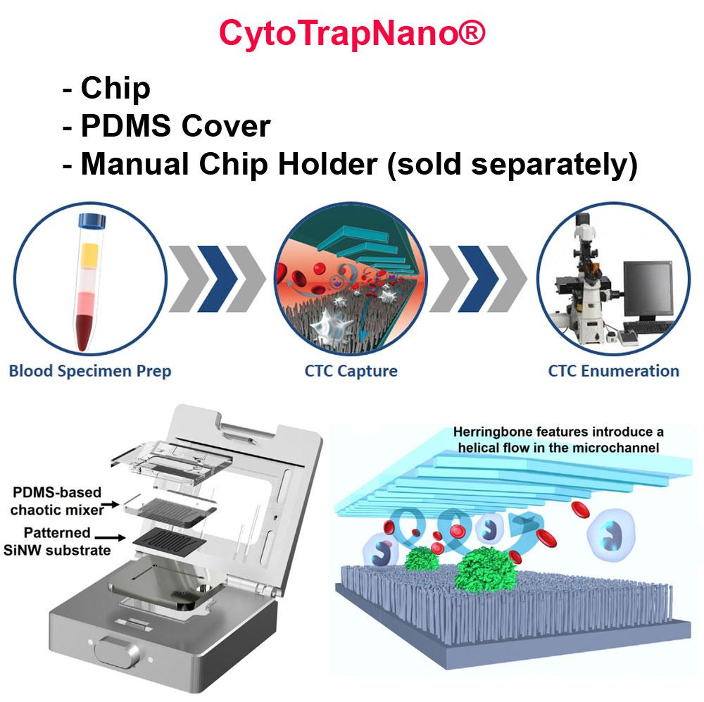 在 CytoTrapNano® 芯片上捕获和免疫荧光染色的细胞可以用荧光显微镜观察。* CytoTrapNano® 系统已用于临床研究以捕获来自前列腺癌、皮肤癌、胰腺癌、肝癌、肾癌和肺癌患者的 CTC。 这些设备还被用于临床研究,以捕获和识别从孕妇抽取的血液中的稀有胎儿细胞。 这些结果发表在高影响力期刊上。
