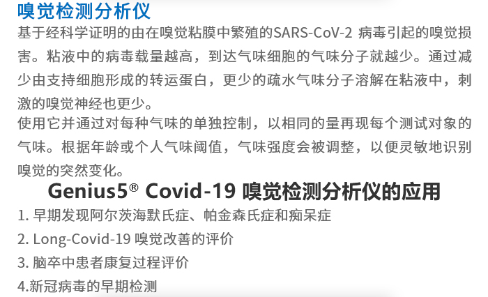 可在鼻腔产生精雀定量和可重复的嗅觉刺激,以客观的实验方法对嗅觉的识别、鉴别和气味阈值敏感度等进行功能评估。可以多至4种(并可混合)的嗅剂、以不同的浓度提供嗅觉刺激。