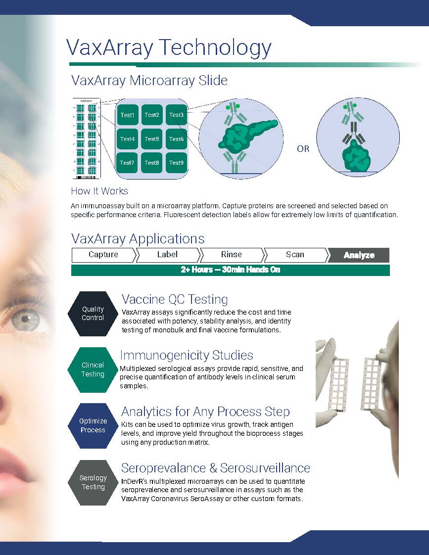 VaxArray 平台是美国 InDevR 公司生产研发的一个简单易用的系统,该平台使用多种现成的试剂盒,通过对微阵列的快速、高分辨率的成像分析,可以实现在单个平台上,对多种疫苗实现从临床功效,疫苗稳定性及疫苗效力等多方面的应用分析。VaxArray 是疫苗生产商灵活而强大的工具,可以为疫苗生产和流程you化方面提供巨大帮助。 VaxArray?应用 新冠病毒 用于疫苗开发的抗原或抗体反应的量化。SARS-CoV-2 大流行和地方性毒株的多重测量。 麻疹和风疹 当天抗原定量。分析单价麻疹、单价风疹或二价疫苗样品。 脊髓灰质炎病毒 血清型特异性和稳定性表明脊髓灰质炎病毒抗原定量。只需 1 小时即可获得结果。 流感 简化和加速抗原表征。用于对流感疫苗进行可靠的亚型特异性定量的单价和多价试剂盒。 肺炎球菌 标准化 CQA 检测试剂盒,用于对高度多价药物产品进行快速、灵敏的鉴定、数量和稳定性检测。在单次测定中分析多达 23 种多糖血清型。