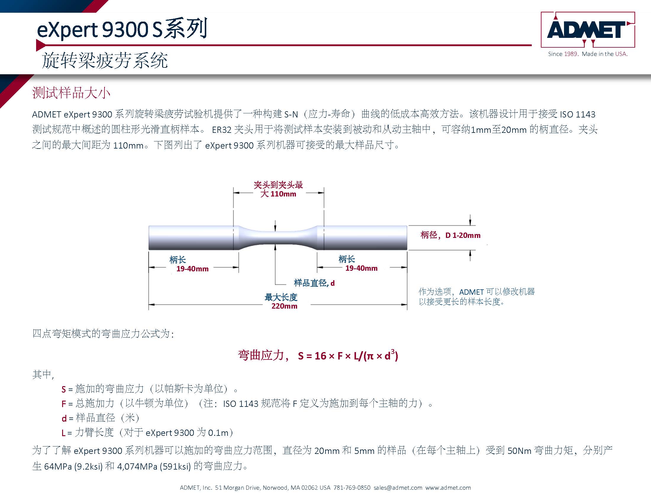 eXpert 9300S系列旋转梁疲劳系统 ADMET eXpert 9300 系列旋转梁机以高达 100 Hz 的频率对金属样品进行完反向疲劳测试。它是一款低成本精巧型桌面装置,符合 ISO 1143 旋转杆弯曲测试规范,适合生成构建 S-N(应力-寿命)图所需的数据。
