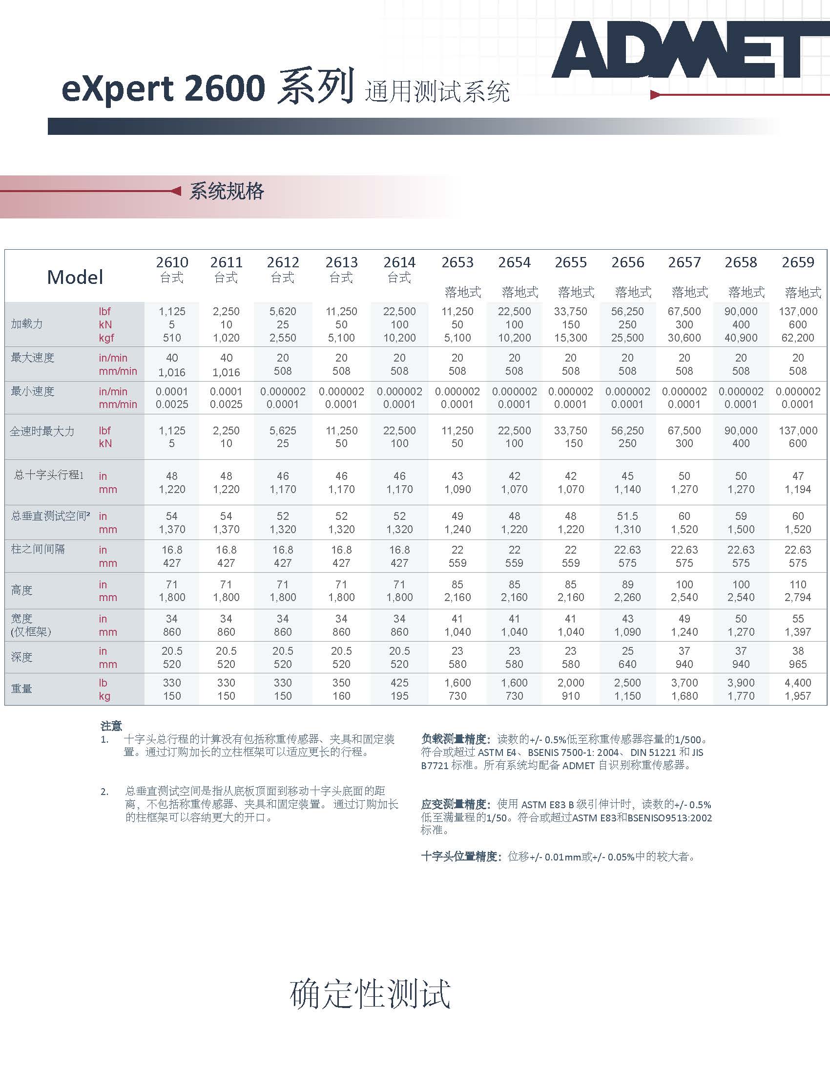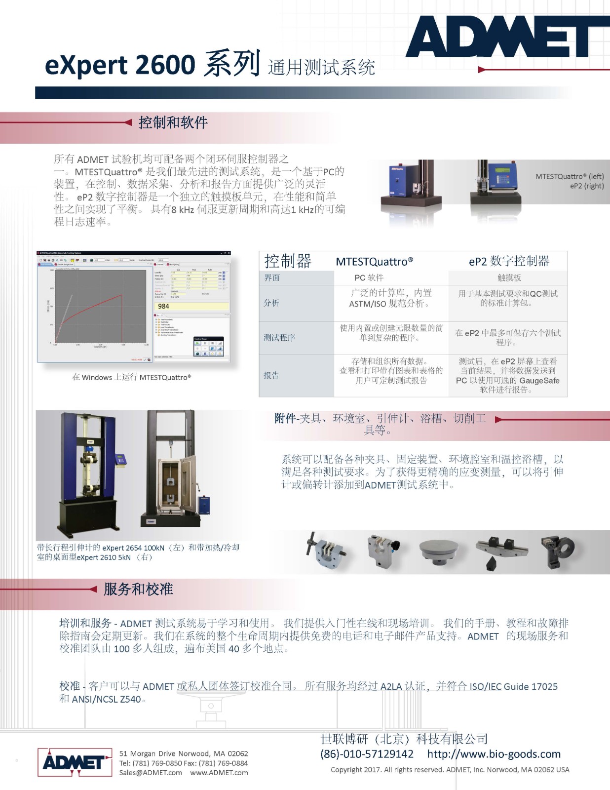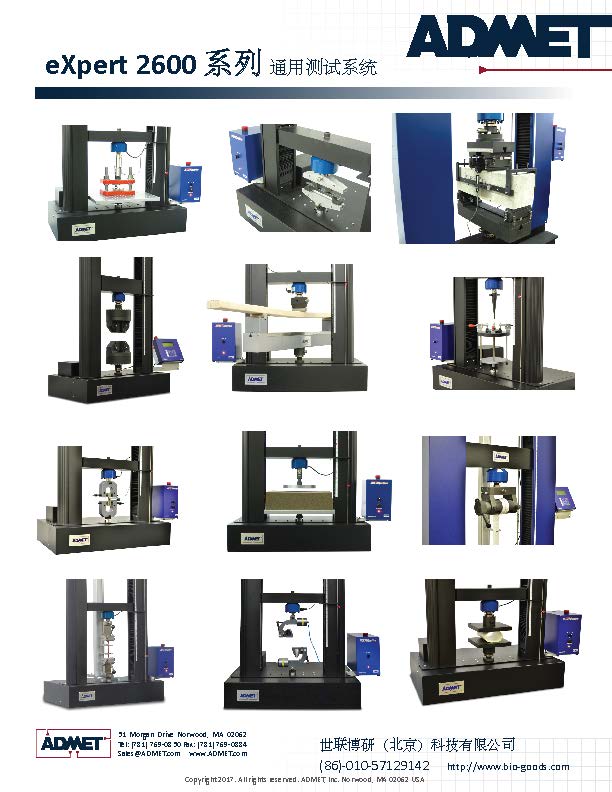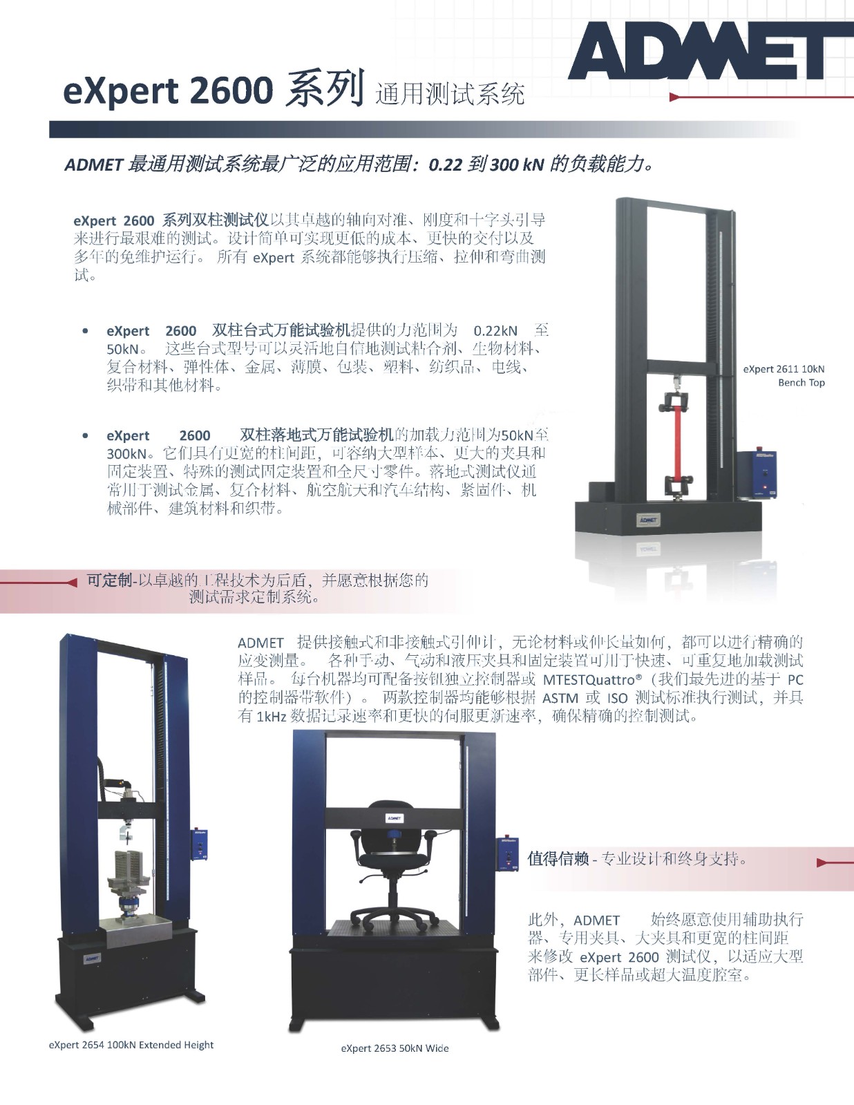 eXpert 2600 双柱测试系统| 功能强大且用途广泛 eXpert 2600系列试验机提供 2kN 至 600kN 的台式或落地式标准配置。 这些系统凭借其卓越的轴向对准、刚度和十字头引导来完成艰难的测试。 简单的设计可实现更低的成本、更快的交付以及多年的免维护运行。所有 eXpert 系统都能够执行可靠且可重复的拉伸、压缩、剥离和弯曲测试。 ADMET为系统提供系列的夹具、称重传感器、引伸计以及加热和冷却装置。由于我们的材料测试机是在马萨诸塞州诺伍德设计和制造,因此我们的团队可以提供定制产品,包括更高的力容量、更长的行程、增加的柱之间的距离等等。 若需要一些特别的东西,请与我们工程师讨论。