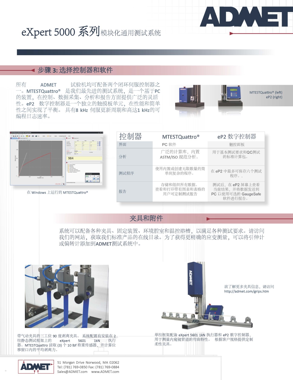 eXpert 5000 系列模块化通用测试系统 eXpert 5000系列测试系统采用模块化设计;您可以选择执行器、测试框架和控制器来满足您的测试需求。 每个系统都配有一个可拆卸的执行器和快速伺服电机。 执行器的作用力范围为 1kN 至 10kN,其中多个执行器能够以高达10Hz 的频率执行疲劳测试。负载框架提供单柱或双柱台式布置,ADMET 甚至可以在必要时定制设计框架。 有两个控制器可用。 MTESTQuattro(R),一个基于 PC 的系统,用于更的材料和产品测试; eP2 是一款适合重复质量控制测试的立数字控制器。 其结果是一个灵活的模块化系统能够执行各种测试。