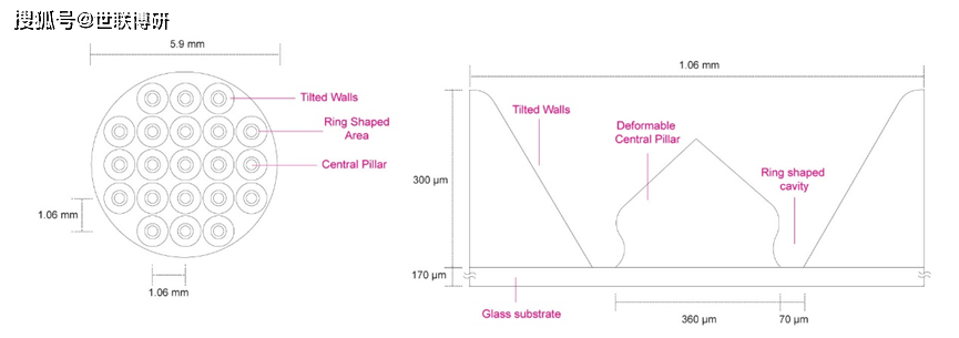 >细胞培养基质基于生物相容性聚乙二醇 (PEG) 水凝胶,其模制微孔包含一个中心柱。 >水凝胶具有细胞排斥性,可防止细胞粘附到基质上。 >微孔的倾斜壁(漏斗形状)允许细胞被引导至圆形空腔,从而减少在接种过程中丢失的细胞数量。 > 在介质交换、添加药物等过程中,环状类器官保持在原位。 这是因为微孔的底部由玻璃制成,使类器官能够锚定在该区域。此外,中央支柱具有“s”形轮廓, 可防止 环因收缩而向上滑动。 >水凝胶的柔软特性(0.1 kPa 至 100 kPa)能够通过中央支柱的变形来量化收缩力。 >凝胶硬度可以根据适当的细胞模型进行调整。 >细胞培养基质与图像采集兼容,因为细胞接种在仅由玻璃组成的区域,细胞周围的 PEG 水凝胶是透明的,并且使用了 #1.5 玻璃(适用于大多数物镜)。 产品优势: > 即用型 将细胞直接铺板在微结构化基底上 > 将您的类器官放置在适当的位置 由于创新的设计,环在操作过程中保持在原位 > 收缩力测量 通过基于水凝胶的中央支柱的变形测量收缩力 > 可预测的位置和易于成像 细胞聚集体位于可预测的位置,可实现自动图像采集(明场、荧光、相差等) > 基材的可调刚度 模拟细胞类型的体内环境控制底物硬度